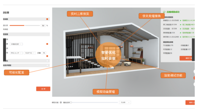 提升項目承載量:模型減面、紋理壓縮、動畫降重、模型量化、模型合成、模型壓縮全方位優化處理,優化加載、渲染性能,提升孿生項目承載能力。