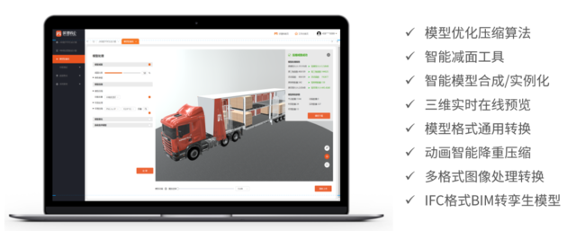 平臺支持通用模型輕量化(減面、合并、壓縮、紋理處理、動畫處理、量化、實例化等),以及BIM模型通用格式IFC的輕量化和轉孿生模型。針對不同類型的模型,可采取不同的輕量化策略: