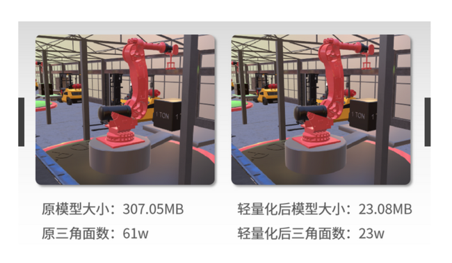 伏鋰碼·模型智能輕量化平臺實現了對模型輕量化前后近乎一致的效果,并對模型的大小進行了數十倍的壓縮,有效提升數字孿生場景加載及模型交互的流暢度。